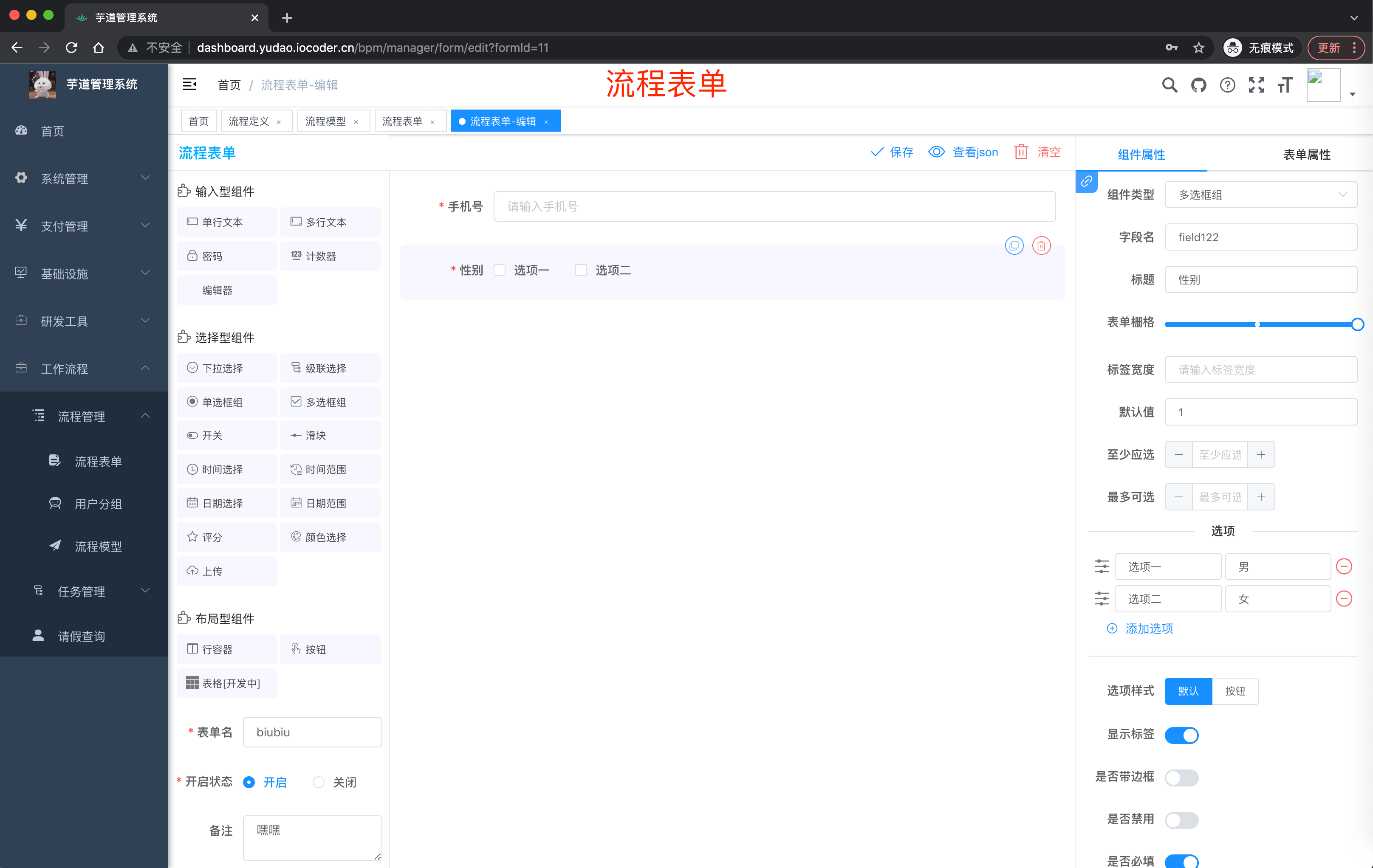 - 工作流使用 Flowable,支持动态表单、在线设计流程、会签 / 或签、多种任务分配方式